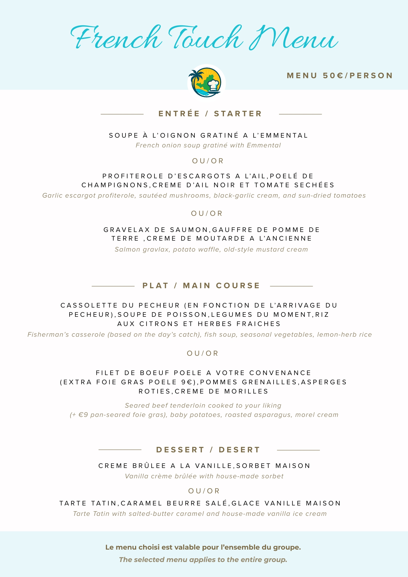 All pricing is confirmed during the quote process. The selected menu applies for the entire group.