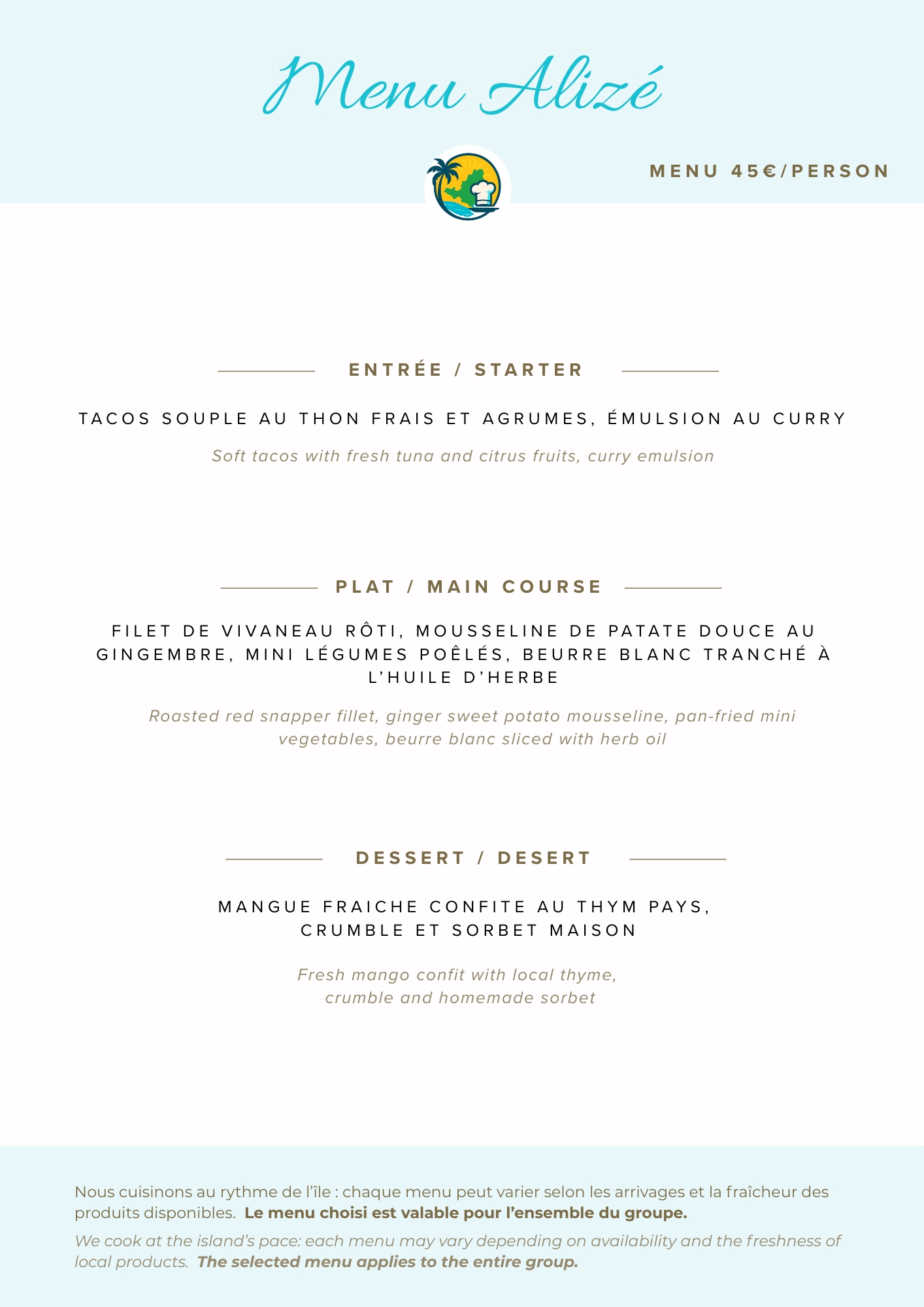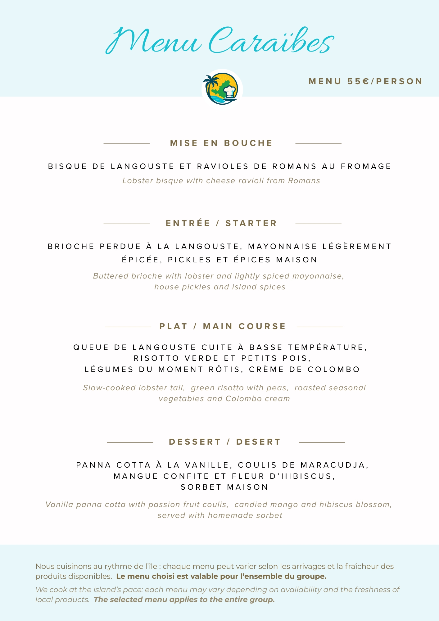 It means designing every menu from scratch, with fresh local ingredients, infused with the refinement of French technique and the vibrant soul of the Caribbean.