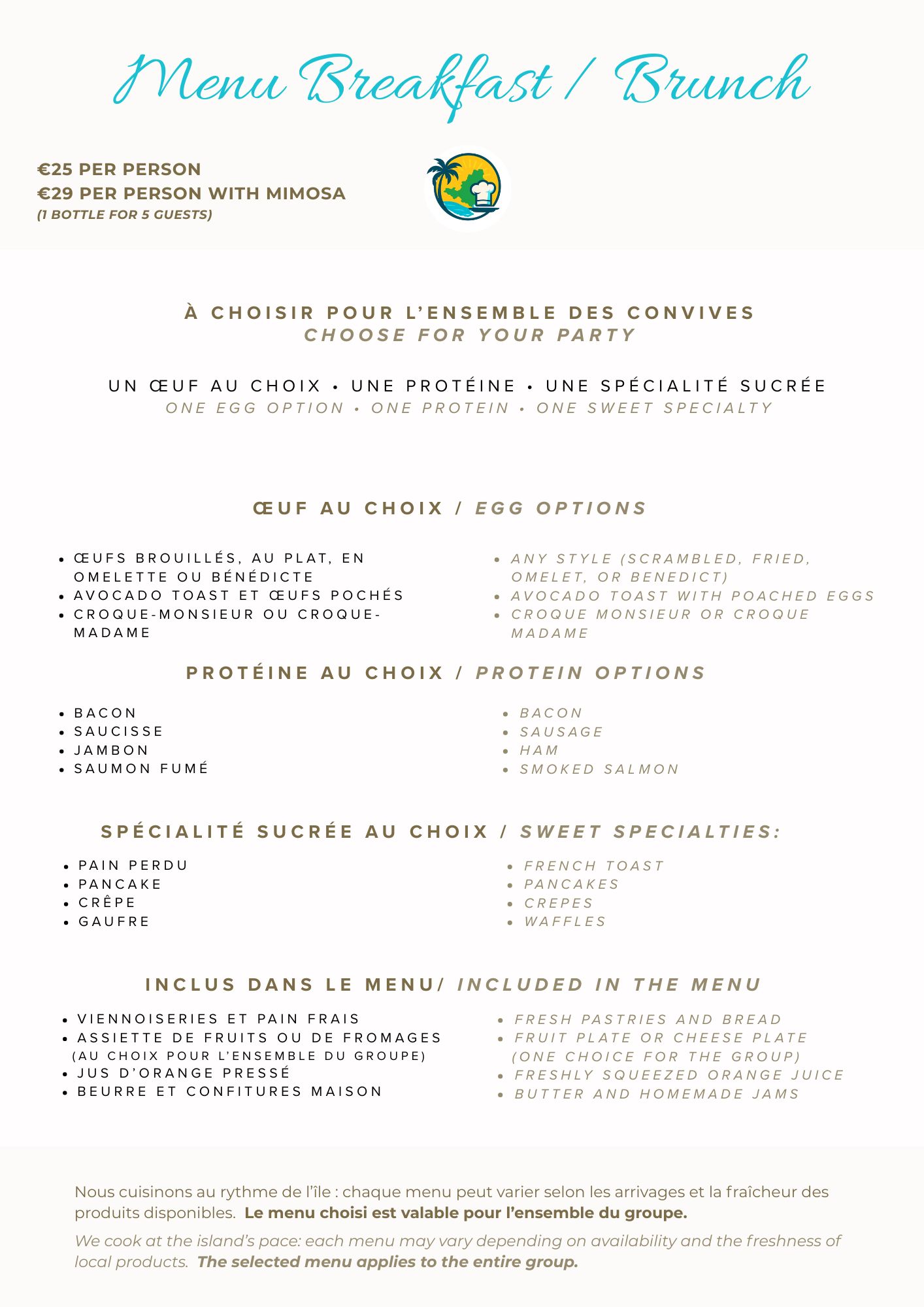 Breakfast/Brunch : 25€/pers